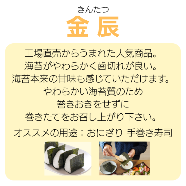 工場直売から生まれた人気商品。歯切れが良く味の乗った国内産海苔を厳選。