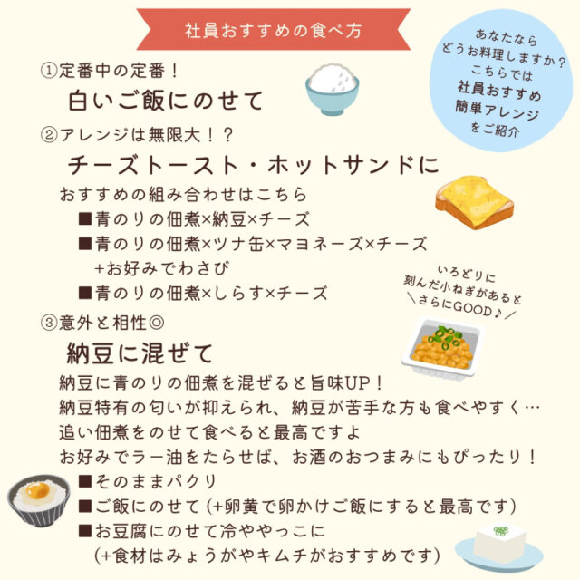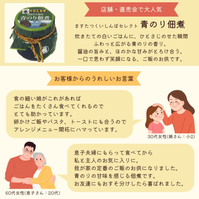 青のりの佃煮は弊社実店舗や直売会での大人気商品です。