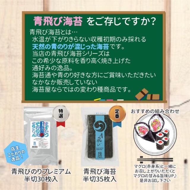 柔らかさや歯切れの良い一番摘み等級、青のりが混じった飛び、混ぜ等級、海苔草原の柔らかさ故に乾燥時に穴があくマル等級など通好みの原料を使用しております。
